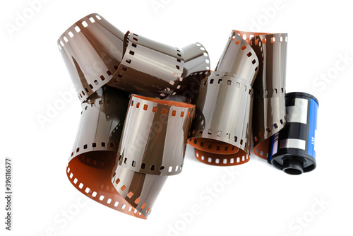 Obraz premium Unfolded new ISO 400 film coming from a blue roll, isolated on a white...