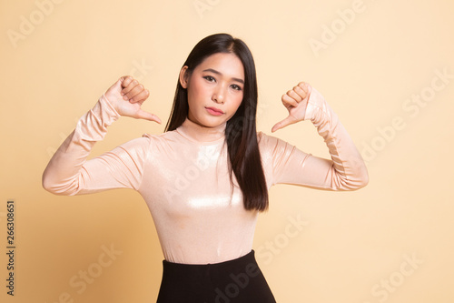 Fototapeta premium Unhappy Asian girl show thumbs down with both hands.