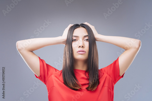 © zinkevych, Fototapeta premium Unhappy. Emotional elegant smart woman standing against the blue background with her hands on her head and feeling sad and lonely