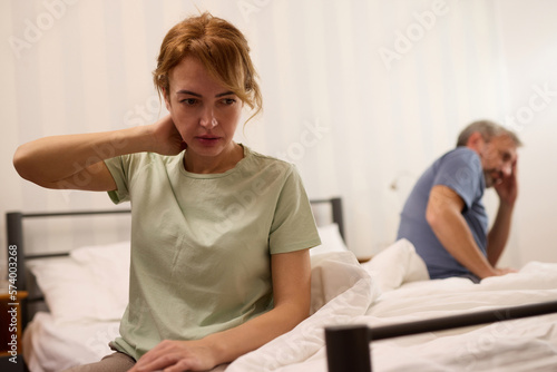 Fototapeta premium Unhappy middle aged couple in bedroom at home