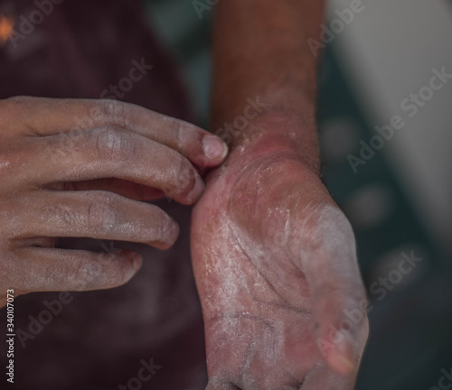 Fototapeta premium unhealthy human skin epidermis texture with flaking and cracked particles close-up.Selective focus
