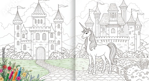 Naklejka premium Unicorn coloring page castle scene