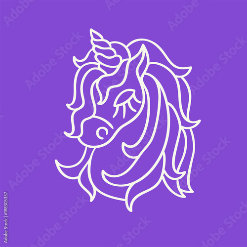 Obraz premium Unicorn head white outline sketch icon on the purple