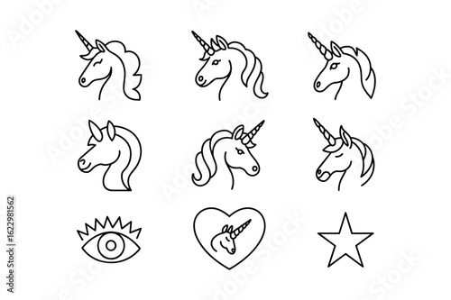 Fototapeta premium Unicorn heads and symbols line art horse horn