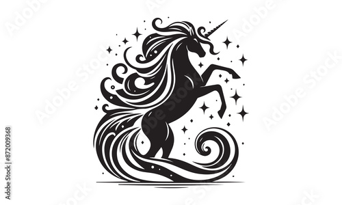 © creative.vector, Obraz premium unicorn, Magic unicorn silhouette, Silhouette of a flying unicorn, Unicorn head circle tattoo illustration, horses tattoo. Black unicorn silhouette vector style and white background