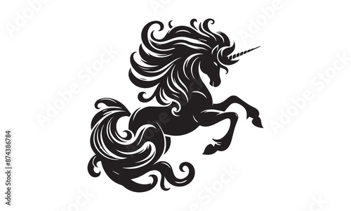© creative.vector, Obraz premium unicorn, Magic unicorn silhouette, Silhouette of a flying unicorn, Unicorn head circle tattoo illustration, horses tattoo. Black unicorn silhouette vector style and white background