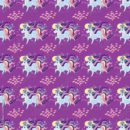 Fototapeta premium Unicorn pattern. Vector seamless pattern with white unicorns, rainbow and stars. Isolated on a purple background.