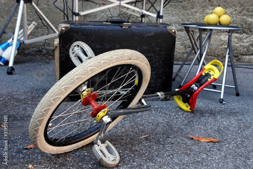© amerigo donnarumma, Fototapeta premium unicycle and suitcase for street artists