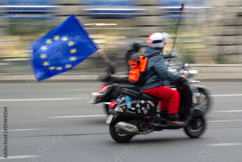 © brajianni, Fototapeta premium Unidentifiable man in red jacket in out of focus on motorcycle with EU flag with yellow stars. Street blurry defocused photo.Concept of transport, rally on city street, protest. Blurred background