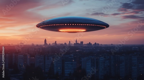 © Aliando, Fototapeta premium Unidentified aerial object hovering over the cityscape at twilight hour