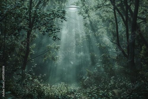 © ChaoticMind, Obraz premium Unidentified flying object hovering over magical forest at night