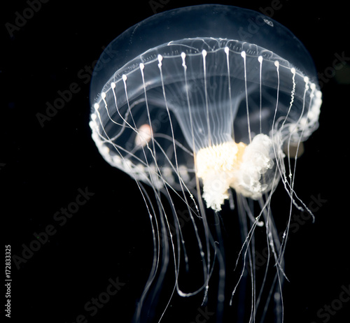 Naklejka premium Unidentified jellyfish species at night in the ocean.
