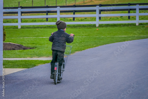 Fototapeta premium Unidentified little amish boy playing with his roller bikes or scootersin the backyard of his house