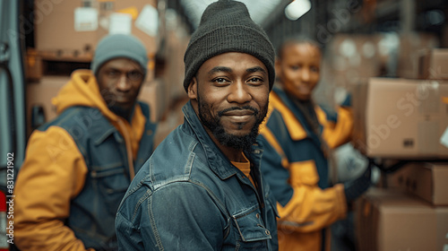 © KADER, Fototapeta premium Uniformed Installation Workers Unloading Boxes and Loading Furniture for Delivery