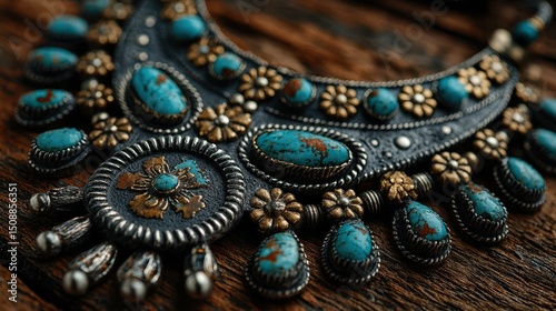 © Michael, Obraz premium Unique artisan necklace featuring turquoise stones and intricate metalwork displayed on rustic wooden surface