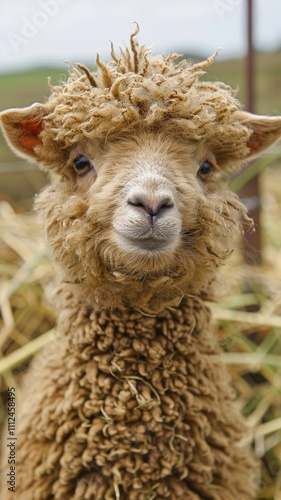 © Truprint, Obraz premium Unique brown ram with fluffy curls stands amidst straw in a serene farm setting during daylight