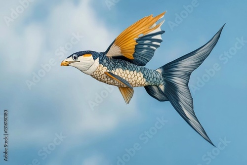Naklejka premium Unique depiction of a fish with wings soaring through a bright blue sky...