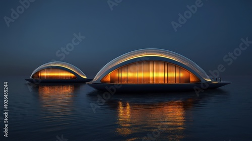 Naklejka premium Unique modern buildings with illuminated interiors on calm water at night.