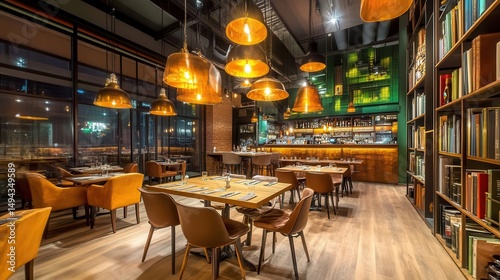 © SaraPuspita, Obraz premium Unique settings of cafe interior with bookshelves and hanging lamps
