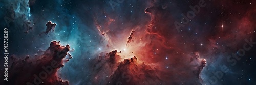 © Rebound Gallery, Fototapeta premium Unique space illustration background red and blue themed nebulas and interstellar clouds with stars in distance