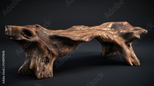 Fototapeta premium Unique wooden bench crafted from natural wood, showcasing intricate textures against a dark backdrop