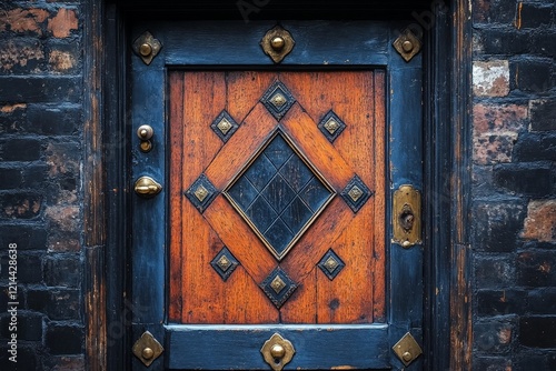 Fototapeta premium Unique wooden door with geometric design and metal accents blends history...