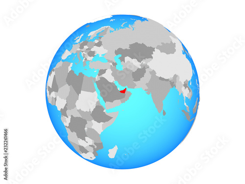 Fototapeta premium United Arab Emirates on blue political globe. 3D illustration isolated on...