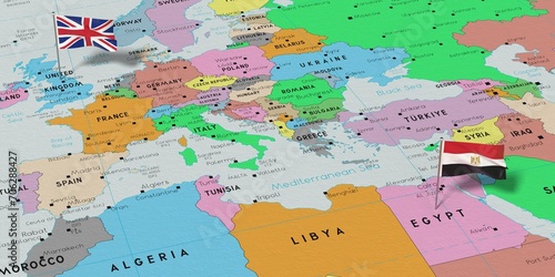 © PX Media, Naklejka premium United Kingdom and Egypt - pin flags on political map - 3D illustration