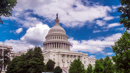 © Mose Schneider, Naklejka premium United States Capitol, the Capitol Building West front in low angle view against the cloudy blue sky. The United States of America Congress, Washington, D.C., USA, U.S. US.