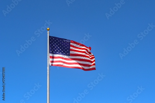 © Cerib, Fototapeta premium United States of America national flag The Stars and Stripes, isolated against a deep blue sky. Copy space. No people.