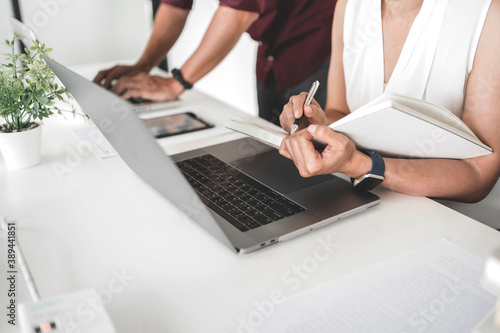 Fototapeta premium University students sitting on the table brainstorming projects working in...