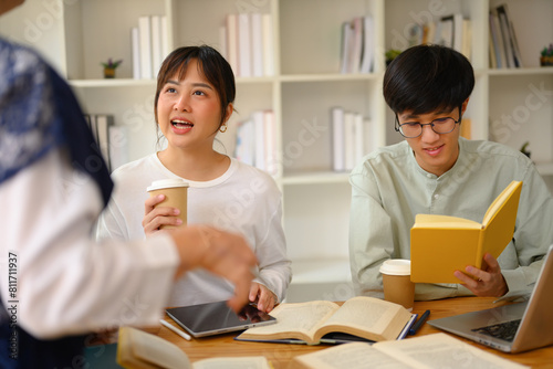 © Prathankarnpap, Fototapeta premium University students working on their assignment with help from teacher