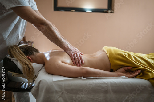 © Miljan Živković, Obraz premium unknown woman enjoy back massage at beauty spa male therapist