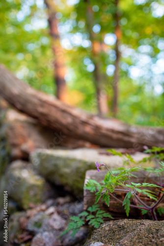 © ke._.si, Fototapeta premium Unkraut wächst auf einer Mauer im Wald