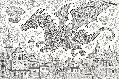 Naklejka premium Unleash your imagination with this fantasy scene of a mighty dragon soaring over a medieval village. Intricate line work and high detail make it perfect for adult fantasy fans and colorists