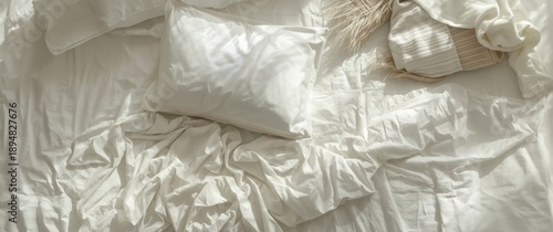 Fototapeta premium Unmade bed with memory foam cushion and hypoallergenic pillow, wrinkled sheets, top perspective