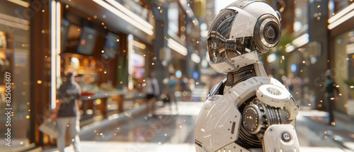 Fototapeta premium Unreal Engine 3D Daily Interaction with Robots, Retail_Store_Environment, Industrial_Robot, Cleaning_Activity, Disabled_User, Noon_Time, AI_Technology, Transparent_Design_Visual_Effects, Curious_Mood,