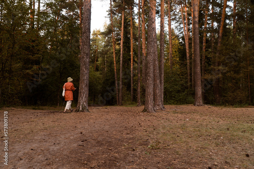 © Natalia Navodnaia, Fototapeta premium Unrecognisable woman in hat and linen wear at walk in forest