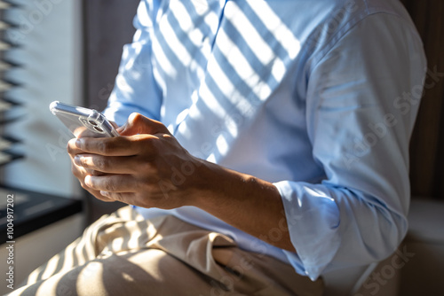 Obraz premium Unrecognizable businessman holding smartphone using digital technology...