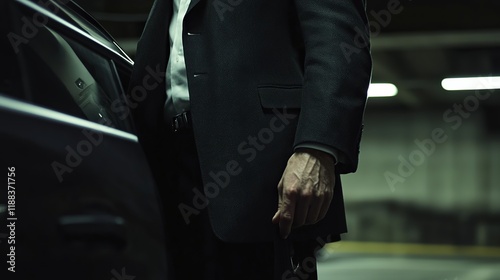 © Elshad Karimov, Naklejka premium Unrecognizable businessman opens car door while standing in garage. The picture is cropped, so only the man's torso and the car door are visible.