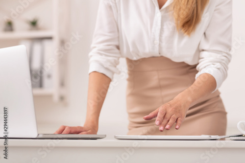 © Prostock-studio, Fototapeta premium Unrecognizable Businesswoman Using Tablet And Laptop Standing In Office
