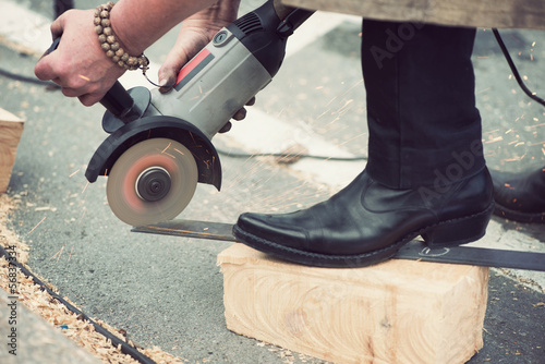 © Nickola_Che, Obraz premium Unrecognizable female blacksmith grinding a metal plate