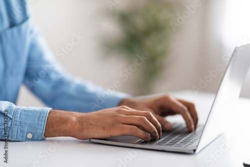 © Prostock-studio, Fototapeta premium Unrecognizable Male Working With Laptop At Desk In Office