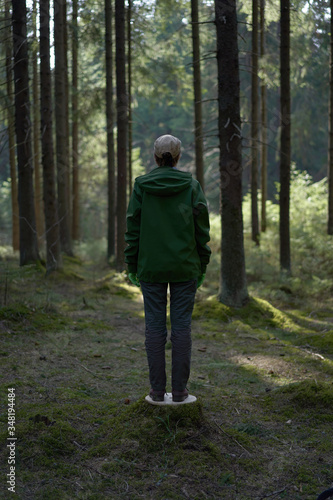 Fototapeta premium Unrecognizable man in a green plastic mask in the forest as a symbol.