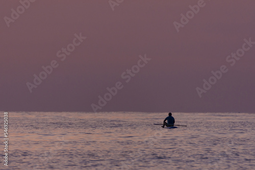 © Julian, Naklejka premium Unrecognizable man sitting on a paddle board in the sea while appreciating the sunrise