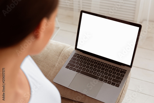 © Prostock-studio, Naklejka premium Unrecognizable Woman Looking At Laptop Empty Screen Browsing Internet Sitting At Home. Mockup, Selective Focus