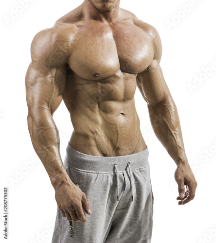 Fototapeta premium Unrecognizable young man with naked muscular torso, wearing jeans, isolated...