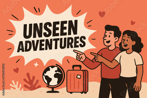 © Viacheslav, Obraz premium Unseen Adventures Await. Unseen adventures banner, flat vector illustration, bold oversized text inside splash explosion, cartoon characters standing and
