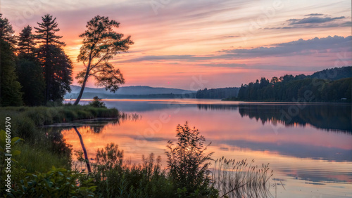 Fototapeta premium unset over a serene lake with peaceful mood and gentle evening light in an...