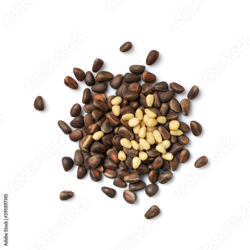 © viktoriya89, Obraz premium Unshelled pine nuts isolated on white